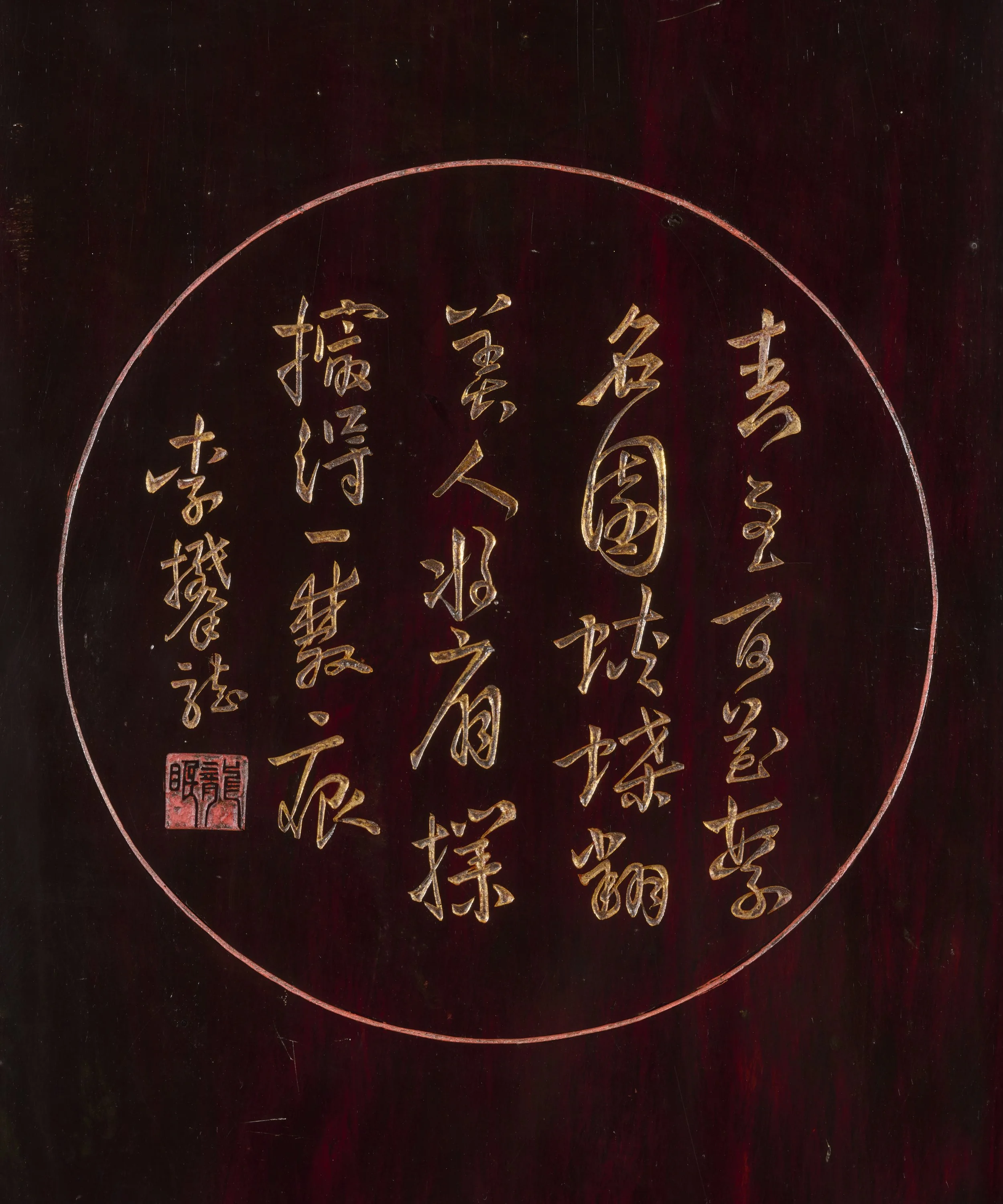 The richly ornamented frame is adorned with poetic inscriptions, miniature landscapes, and motifs of antiquities derived from late Ming woodblock-print traditions, reflecting the close dialogue between lacquer, painting, and printed design. Decorative elements such as Xuanji Yuheng—associated with cosmology and classical scholarship—attest to the intellectual depth embedded within its ornament.