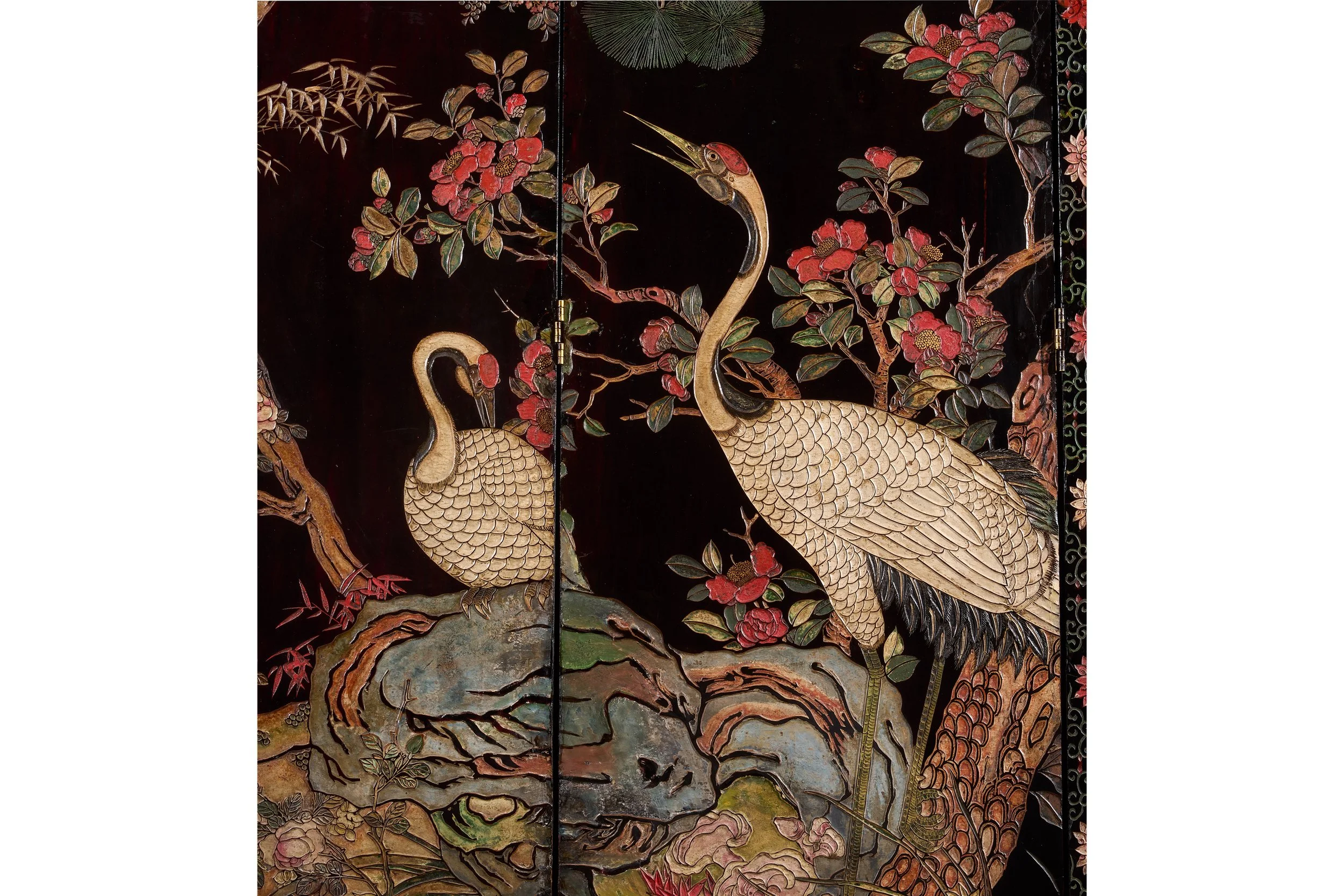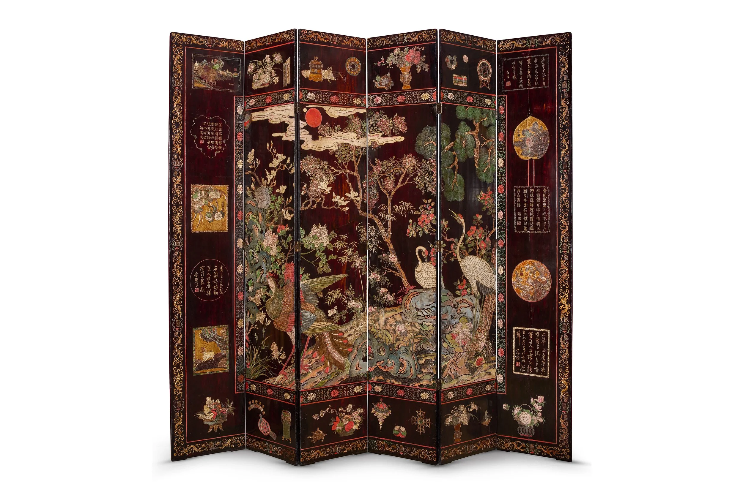 A rare and monumental kuancai lacquer screen from the Kangxi era, this six-panel work centers on the auspicious Bainiao Chaofeng (Hundred Birds Paying Tribute to the Phoenix) motif. The front panel depicts a phoenix attended by cranes amid pine, bamboo, blossoms, and rockwork beneath a radiant sun—an emblem of harmony, virtue, and celebration
