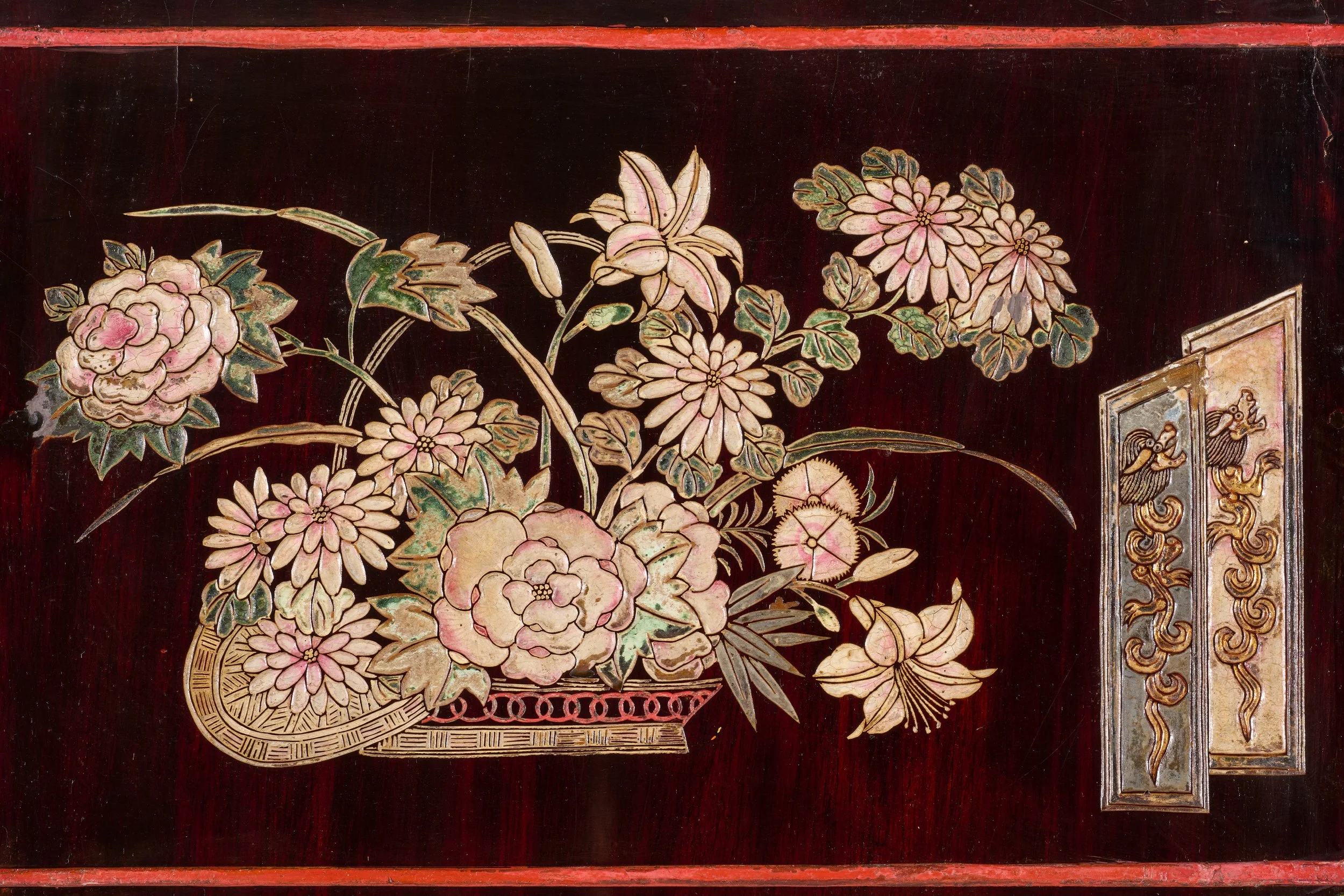 China - Wood, lacquer, pigments and gold; metal mounts